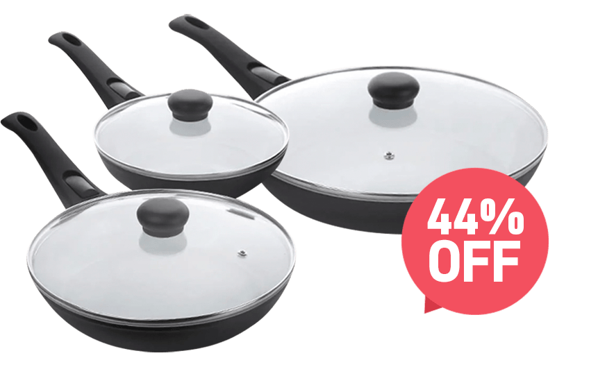 Our deluxe cookware set comprises three high-quality ceramic frying pans of different sizes, including: